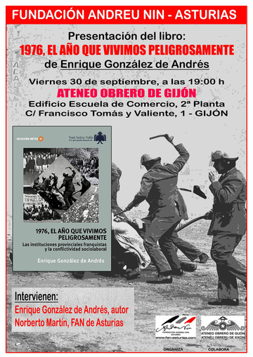 El próximo viernes, 30 de setiembre, a las 19H.00', en el local social del Ateneo Obrero de Gijón (2ª Planta de la Escuela de Comercio, Cl Francisco Tomás y Valiente, 1), tendrá lugar la presentación del libro 1976, el año que vivimos peligrosamente, de Enrique González de Andrés. El acto está organizado por la Fundación Andreu Nin Asturias, con la colaboración del Ateneo Obrero de Gijón.