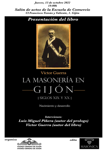 El próximo jueves, 13 de octubre, a las 19H.00', en el Salón de Actos de la Escuela de Comercio (Cl Francisco Tomás y Valiente, 1), tendrá lugar la presentación del libro La Masonería en Gijón. Siglos XIX y XX. Nacimiento y desarrollo, de Víctor Guerra.
