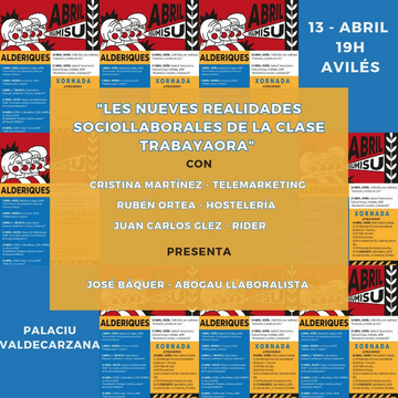 El viniente xueves 13 d'abril, a les 19:00 h., nel Palaciu Valdecarzana, Asturies Insumisa entama una charra-alderique, na que, col títulu "Les nueves realidaes de la clas obrera", van analizase les nueves formes de contratación que tán escomenzando a facese realidá y les nueves rellaciones llaborales que traen asociaes.