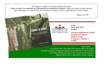 El próximo lunes, 24 de abril, a las 19:00h., en el Salón de Actos de la Escuela de Comercio (Cl Francisco Tomás y Valiente, 1), organizada por el Ateneo Obrero de Gijón, tendrá lugar la presentación del libro Llanes ¡a volar! Un aeródromo en el horizonte de la aeronáutica de Asturias, del que es autor Higinio del Río y está editado por Conais Gestión Editores.