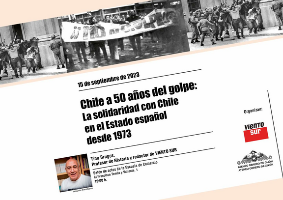 El próximo viernes 15 de setiembre, a las 19:00h., en el Salón de Actos de la Escuela de Comercio, organizada por la revista Viento Sur y el Ateneo Obrero de Gijón, tendrá lugar una charla bajo el título Chile a 50 años del golpe: la solidaridad con Chile en el Estado Español desde 1973, a cargo de Tino Brugos.