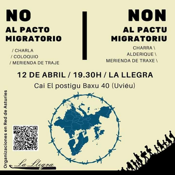 El vienres 12, a les 19:30 nel espaciu @la_llegra, con una charra de la mano de dos compañeros del movimientu "fuego al pacto migratorio" y clausuraremos la xornada con una merienda de traxe nel mesmu espaciu. Onde compartiremos esperiencies, intercambios de idees y sobre too nos acompañaremos p'afrontar el llargo camin que depara esta Europa Fortaleza y les sos necropolíticques.