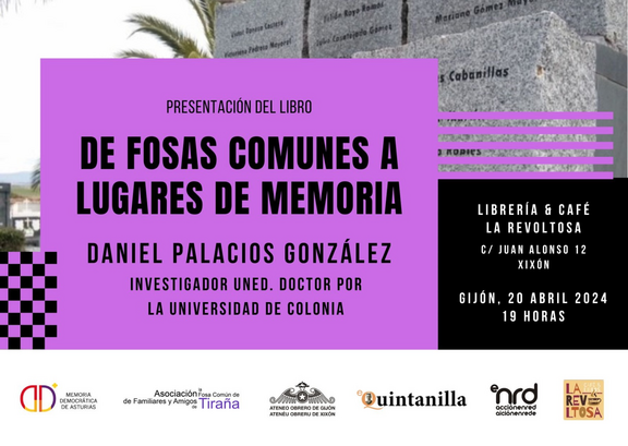 No te pierdas la presentación de un libro que marca un hito en el estudio de la memoria histórica: "De fosas comunes a lugares de memoria" de Daniel Palacios González, que ha sido galardonado con el prestigioso premio internacional "First Book Award 2023". El 20 de abril a las 19:00, La Asociación de Familiares y Amigos de la Fosa Común de Tiraña, Memoria Democrática Asturias; acciónenred Asturies y Grupo Eleuterio Quintanilla os esperamos en La Revoltosa, libros y café