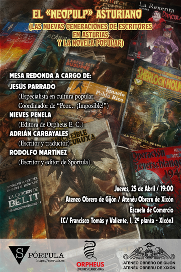 El próximo jueves, 25 de abril, a las 19H.00', en local social del Ateneo Obrero de Gijón (2ª Planta de la Escuela de Comercio, Cl Francisco Tomás y Valiente, 1), tendrá lugar una mesa redonda bajo el título El "neopulp" asturiano (Las nuevas generaciones de escritores en Asturias y la novela popular).