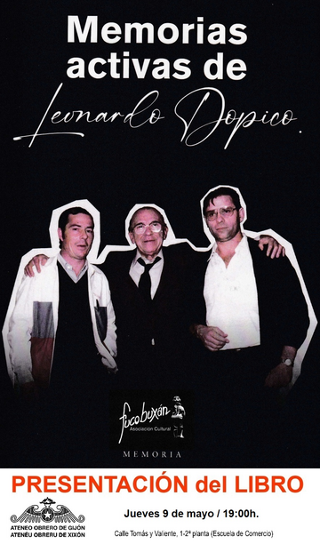 Este jueves, 9 de mayo, a las 19H.00', en local social del Ateneo Obrero de Gijón (2ª Planta de la Escuela de Comercio, Cl Francisco Tomás y Valiente, 1), tendrá lugar la presentación del libro Memorias activas de Leonardo Dopico, editado por la Asociación Cultural Fuco Buxán.