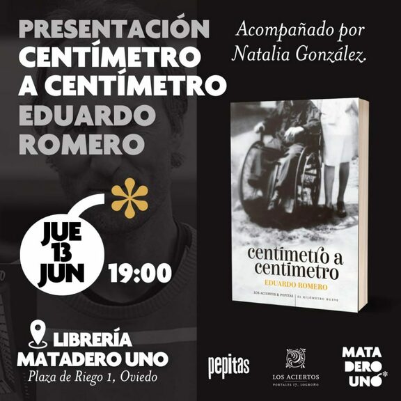 El escritor ovetense Eduardo Romero acaba de publicar su nuevo libro, "Centímetro a centímetro", con la editorial Pepitas de Calabaza. Un librito de apenas 65 páginas en el que narra el minuto a minuto de un anciano y la mujer que lo cuida. En palabras del filósofo y escritor Santiago Alba Rico, se trata de "una emocionante historia sin adjetivos: una pura descripción minuciosa y atenta de operaciones físicas en torno a un cuerpo que, al mismo tiempo, a través de esa atención, se vuelve indispensablemente humano".