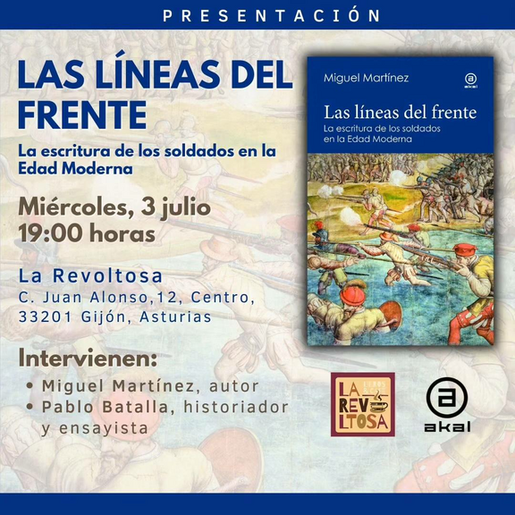 Este miércoles tendremos con nosotras a Miguel Martínez presentando "Las líneas del frente", de @ediciones_akal . Hace unos años ya le tuvimos por acá presentado su libro "Comuneros", de @hojadelata_editorial . Un lujazo poder tenerlo por acá, y un lujo que esté acompañado por Pablo Batalla
