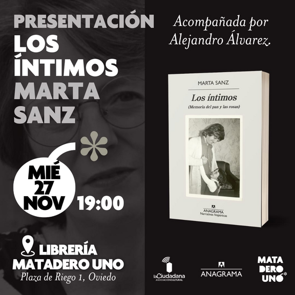 Volvemos a acompañar a Marta Sanz en la presentación de su último libro (Los íntimos). Será este miércoles 27 de noviembre en la Librería Matadero Uno. "Un ejercicio literario libérrimo, batallador, rebosante de reflexiones sagaces y de un gozoso sentido del humor. He aquí condensada la vida (y milagros), el cuerpo, de una escritora perpleja ante la realidad y empeñada en seguir tomando la palabra." Entrada libre hasta completar aforo.