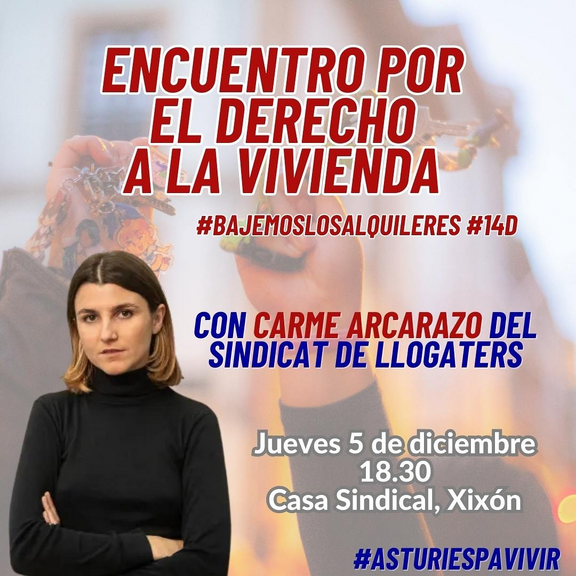 Sindicalismo, organización y lucha por la vivienda con Carme Arcarazo del Sindicat de Llogateres i Llogaters. El jueves 5 en la Casa Sindical de Xixón a las 18:30 junto a todos los colectivos que confluyen en la iniciativa Asturies pa vivir organizamos esta charla taller camino de la manifestación del 14 de diciembre.