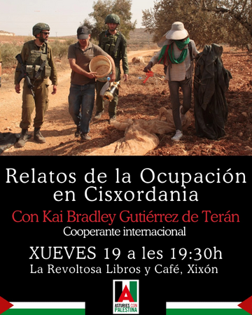 El jueves 19 de diciembre a las 19:30h en @larevoltosagijon el cooperante Kai Bradley nos contará su experiencia después de 3 meses de trabajo en Cisjordania. Como es la vida bajo la ocupación y el apartheid y los abusos de colonos y FDI. En colaboración con @asturies_con_palestina