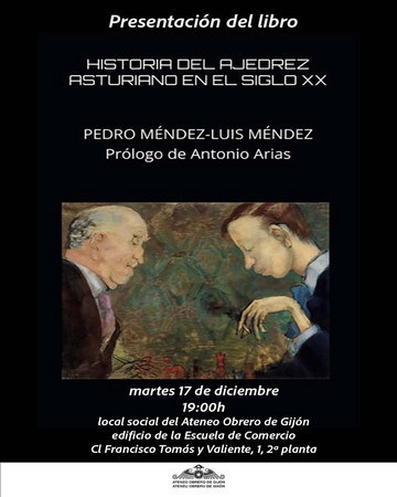 El próximo martes, 17 de diciembre, a las 19H.00', en local social del Ateneo Obrero de Gijón (2ª Planta de la Escuela de Comercio, Cl Francisco Tomás y Valiente, 1), tendrá lugar la presentación del libro Historia del ajedrez asturiano en el siglo XX, del que son autores Pedro Méndez y Luis Méndez, miembros de la comisión de historia de la FAPA (Federación de Ajedrez del Principado de Asturias). El libro cuenta con un prólogo de Antonio Arias.