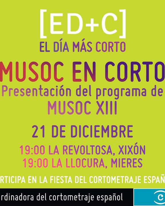 Sábado 20/ 19:00/ Presentación del programa de @musoc_asturias , en la que habrá un sesión de cortometrajes titulada: La mujer como centro del relato.