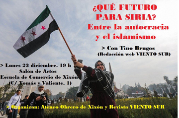 El próximo lunes, día 23 de diciembre, a las 19H.00', en el Salón de Actos de la Escuela de Comercio (Cl Francisco Tomás y Valiente, 1), tendrá lugar una charla bajo el título ¿Qué futuro para Siria? Entre la autocracia y el islamismo, a cargo de Tino Brugos (Redacción web de VIENTO SUR)