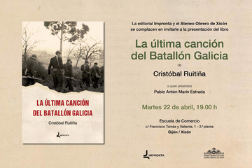 El próximo martes, 22 de abril, a las 19H.00', en local social del Ateneo Obrero de Gijón (2ª Planta de la Escuela de Comercio, Cl Francisco Tomás y Valiente, 1), tendrá lugar la presentación del La última canción del Batallón Galicia, del que es autor Cristóbal Ruitiña.