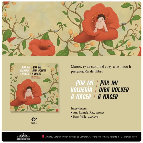 El próximo martes, 17 de junio, a las 19H.00', en local social del Ateneo Obrero de Gijón (2ª Planta de la Escuela de Comercio, Cl Francisco Tomás y Valiente, 1), tendrá lugar la presentación del libro Por mí volvería a nacer / Por mi diba volver a nacer, del que es autora Ana Lamela Rey y está editado por Ediciones Trabe.
