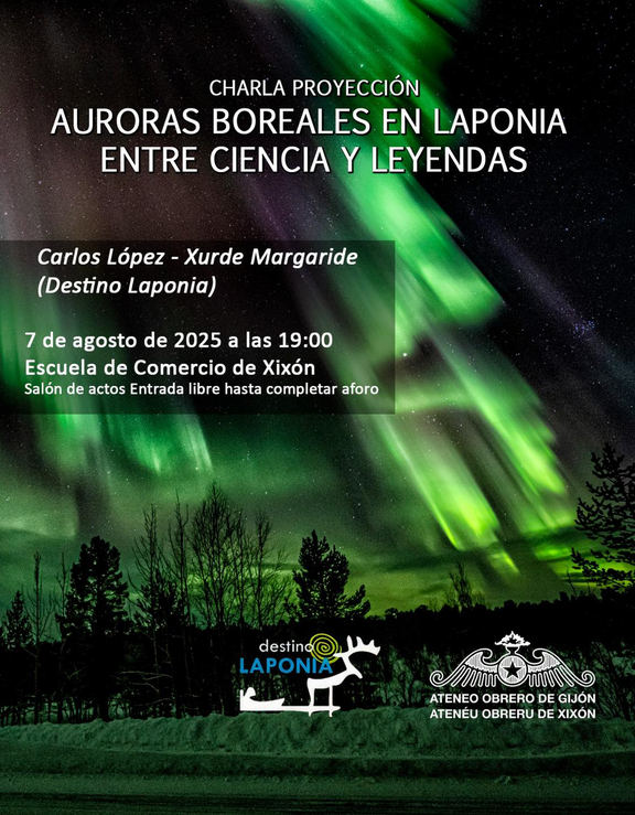 El jueves 7 de agosto, a las 19H.00', en el Salón de Actos de la Escuela de Comercio (Cl Francisco Tomás y Valiente, 1), el Ateneo Obrero de Gijón organiza la charla-proyección "Auroras boreales, entre ciencia y leyendas", a cargo de Xurde Margaride y Carlos López.