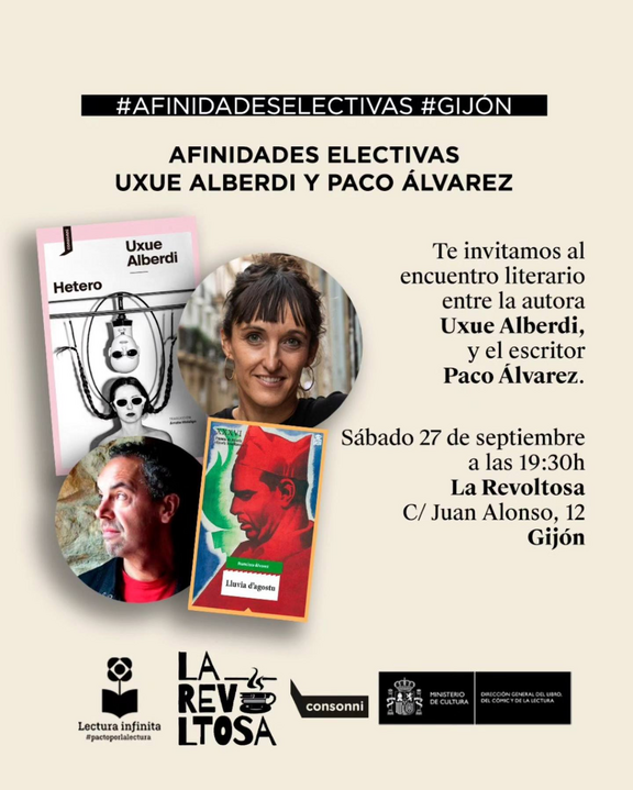 Un encuentro muy especial que es posible gracias al programa de "Afinidades electivas", @librolecturagob, y que contará con ejemplares de los ambos autores, y con la ultimísima novedad de Uxue, "Hetero", que publica la fantástica @_consonni_ , y que sale a la venta pocos días antes. Novedad novedosa recién salida del horno