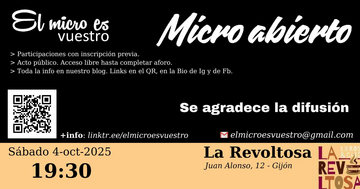 Recordar que el 11 y 12 de octubre se celebrará el IV Encuentro de micros abiertos de Asturias, León y Valladolid. Este año en León. Interesados en participar enviar mensaje.