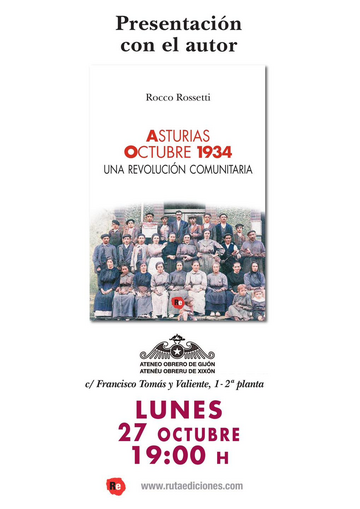 El próximo lunes 27 de octubre, a las 19H.00', en local social del Ateneo Obrero de Gijón (2ª Planta de la Escuela de Comercio, Cl Francisco Tomás y Valiente, 1), tendrá lugar la presentación del libro Asturias Octubre 1934. Una Revolución Comunitaria, del que es autor Rocco Rosseti y está editado por RUTA Ediciones.