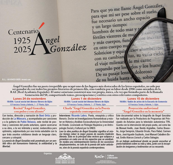 En el centenario de su nacimiento, el Ateneo Obrero de Gijón rinde homenaje a Ángel González, poeta irrepetible que ocupó uno de los lugares más destacados de las letras españolas, no solo por ser ganador de casi todos los premios literarios de primera fila, sino también por su labor desde 1996 como miembro de la RAE (Real Academia Española). El autor asturiano construyó una voz propia, única, a la vez que formaba parte de la llamada Generación del 50, compartiendo temas, preocupaciones y estética con otros relevantes compañeros.