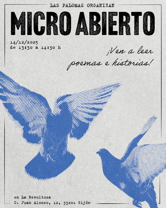 qué ganas tenía de contaros esto!!! el domingo 14 de diciembre a las 13:30 tendrá lugar el primer micro abierto organizado por el espacio de lectura y escritura "las palomas" en la revoltosa, como podéis ver en este cartel tan guapo que diseñó @calambrazo