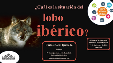 El jueves 11 de diciembre, a las 19H.00', en el Salón de Actos de la Escuela de Comercio (Cl Francisco Tomás y Valiente, 1) tendrá lugar una conferencia bajo el título ¿Cuál es la situación del lobo ibérico?, a cargo del biólogo Carlos Nores Quesada.