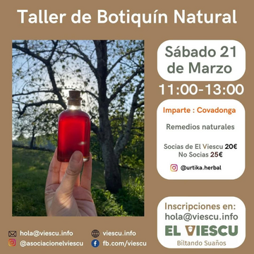 Este taller nos acerca al mundo de la medicina que nos ofrecen generosamente las plantas medicinales, silvestres o de cultivo, alimentos o especias, todas ellas pueden aportarnos alivio frente a desequilibrios y salud natural. Identificaremos algunas plantas en directo, hablaremos acerca de los puntos más importantes a tener en cuenta para cosechar, cómo y cuando, qué partes de las plantas utilizar, aprenderemos acerca del arte de la maceración, la base imprescindible para elaborar remedios naturales a base de plantas y llevaremos a cabo una elaboración medicinal que las participantes se llevaran a sus casas. Incluye E-book con fichas de plantas y recetas.