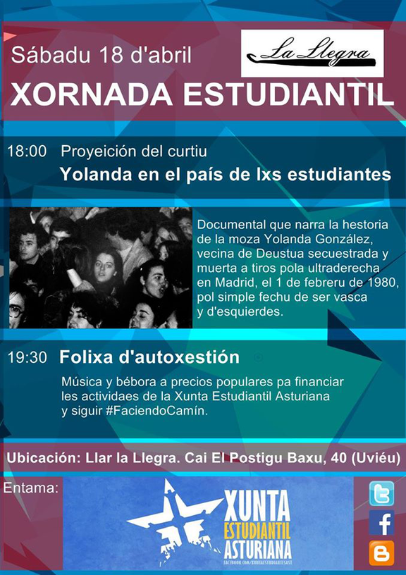 Empezamos a les 18:00 cola proyeición de "Yolanda en el país de lxs estudiantes", alrodiu l'asesinatu de Yolanda González a manes d'ultraderechistes.