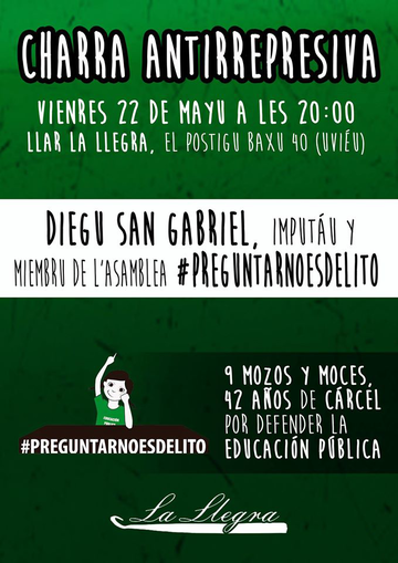 En protesta pola discriminación y represión carecía aquel día na Universidá, en defensa de llibertaes y derechos fundamentales como la Educación, asinca como pa defendenos de la sinrazón policial y xudicial, imputaes, estudiantes y solidaries empecipiemos la campaña #PreguntarNoEsDelito.