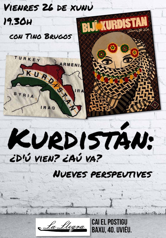 El vienres 26 de xunu a les 19.30h nel Llar La Llegra d'Uviéu cuntamos con Tino Brugos pa falar del Kurdistán, un país a camín ente Turquía, Siria, Iraq, Armenia ya Irán y un pueblu en llucha pola so soberanía y llibertá plena.
