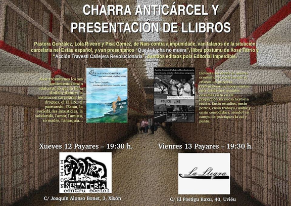 Pastora González, Lola Riveiro y Pisa Gómez, de Nais contra a impunidade, van falanos de la situación carcelaria nel Estáu español, y van presentanos "Que la lucha no muera", llibru póstumu de Xosé Tarrío y "Acción Travesti Callejera Revolucionaria", dambos editaos pola Editorial Imperdible.