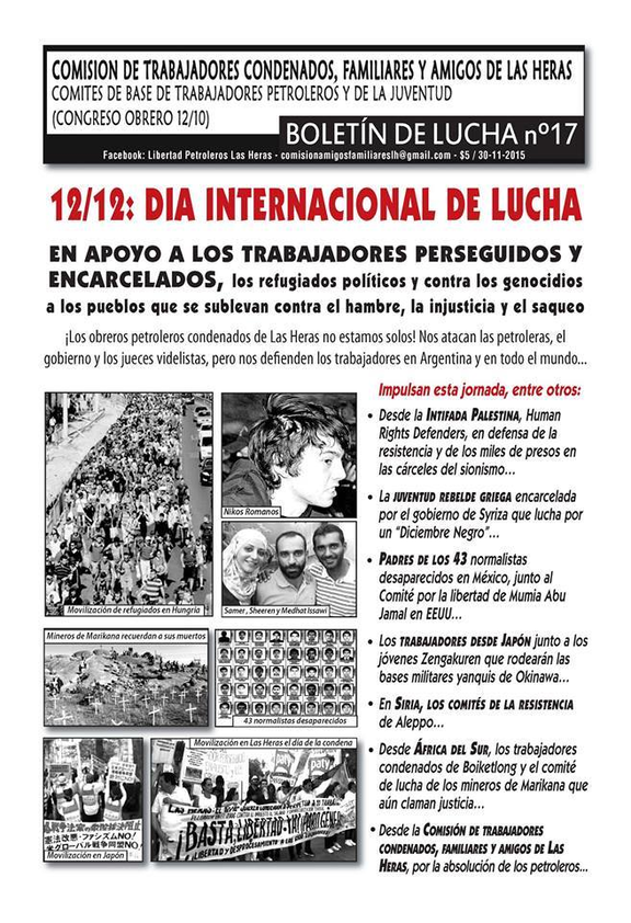 12 DE DICIEMBRE DE 2015: JORNADA INTERNACIONAL POR LA ABSOLUCIÓN DE LOS PETROLEROS DE LAS HERAS (ARGENTINA).