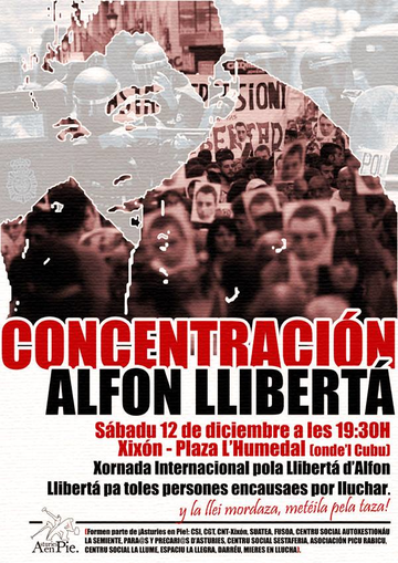 Dende Asturies en Pie afalámosvos a participar nesta concentración pola llibertá y l'absolución de Alfon, de los petroleros de Las Heras y de toles persones encausaes o encarcelaes por lluchar polos derechos obreros y sociales.
