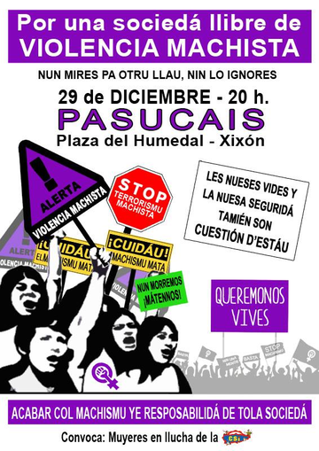 Esti añu ta siendo mui llargu, pero cada díi son más les voces que se unen a esta llucha, y les manes que quieren trabayar y poner el so granín d'arena. El día 29 les cais de Xixón tienen que llenase de voces que glayen contra la VIOLENCIA MACHISTA.