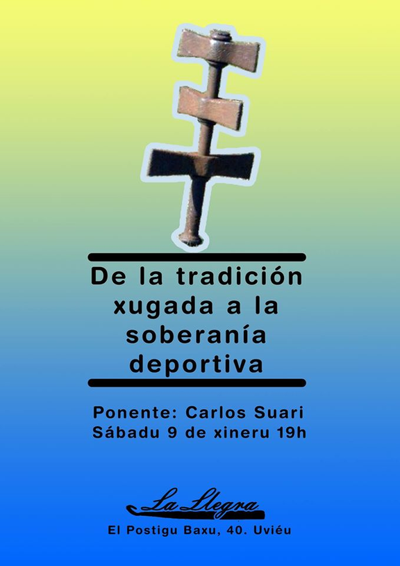 Esti sábadu 9 de xineru a les 19 hores, nel Llar La Llegra (Cai El Postigu Baxu, 40 d'Uviéu) acoyemos una charra de Carlos Suari, llicenciáu en ciencies del deporte y autor del 'Atles de los Bolos Asturianos' col títulu "De la tradición xugada a la soberanía deportiva".