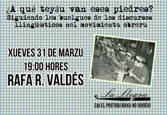 "A qué teyáu van eses piedres" ye'l títulu d'un testu escritu n'asturianu d'un cabezaleru obreru asturianu y tamién títulu escoyíu pa esta charra na que l'hestoriador Rafa R. Valdés va guianos al traviés d'una de les sos especialidaes, asoleyando cómo foi la rellación ente la llingua asturiana y el movimientu obreru. Asina, con un repasu dende'l so surdimientu nel s.XIX va ponese de relieve la rellación ente la identidá llingüística y les cuestiones de clase n'Asturies.