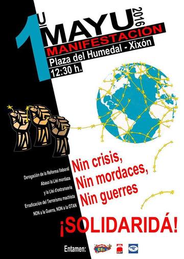 Esti 1u Mayu volvemos a salir a la cai por toles inxusticies que sofrimos la clas obrera. Porque mos quieren ensin drechos, en silenciu, con mieu y en casa pero nun lo van consiguir. Nun sólo nun quedamos en casa nin guardamos silenciu sinon que xuntes/os desiximos la derogación de la Reforma llaboral, la Llei mordaza y la Llei d'extranxería, la erradicación del Terrorismu machista y del terrorismu patronal, la igualdá de drechos pa toles persones y el fin de les guerres.