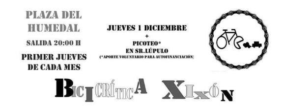 La bicicrítica de Xixón somos un grupo de personas que cogemos la bici a diario y una vez al mes pedaleamos juntxs en una organizada coincidencia, una celebración por un medio de transporte alternativo y más amable, una reivindicación de otra forma de moverse y de vivir la ciudad. Nos juntamos el último jueves de cada mes en la plaza del Humedal, edificio a las 20h.