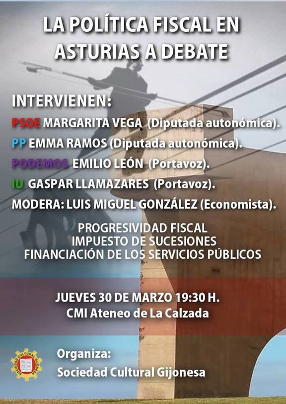 Debate sobre la política fiscal en Asturias en el que tendremos la oportunidad de escuchar las propuestas de diferentes grupos con representación parlamentaria acerca de temas como el Impuesto de Sucesiones, la progresividad fiscal y su relación con la financiación de los servicios públicos.