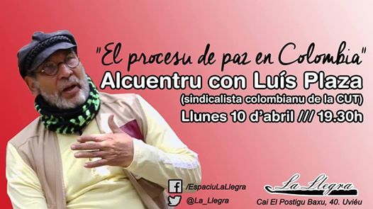 El sindicalista y mayestru colombianu Luís Plaza ta de xira per Asturies y va facer la so primer escala n'Uviéu, nel Llar La Llegra (Cai El Postigu Baxu, 40), el llunes 10 d'abril.
