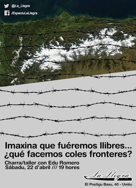 De la mano d'Edu Romero, autor de testos como "¿Quién invade a quién", "Migraciones, fronteras, capitalismo", "¿Qué hacemos con las fronteras?", "Migraciones: entre la idealización y la victimización", "Naiyiria" o, la más recién novela, "En mar abierto", vamos poder participar d'una charra-taller na que discutir sobre los conceutos de frontera, aduana, nacionalidá, "papeles", llibertá y soberaníes.