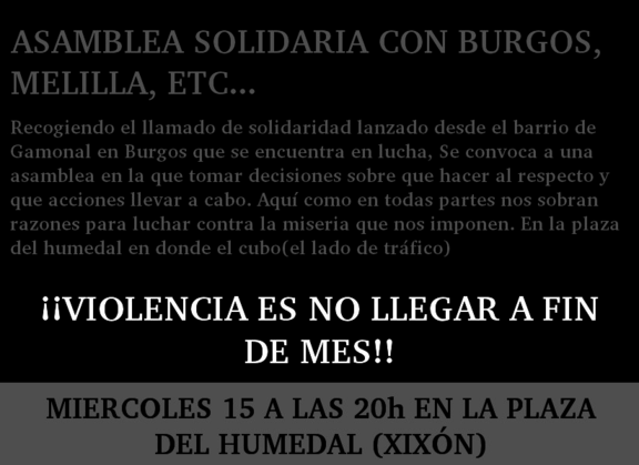 Recogiendo el llamado de solidaridad lanzado desde el barrio de Gamonal en Burgos que se encuentra en lucha, Se convoca a una asamblea en la que tomar decisiones sobre que hacer al respecto y que acciones llevar a cabo. Aquí como en todas partes nos sobran razones para luchar contra la miseria que nos imponen. En la plaza del humedal en donde el cubo(el lado de tráfico)