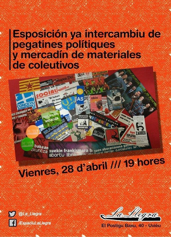 El vienres 28 d'abril a partir de les 19:00 y fasta les 22:00, tendremos nel Llar La Llegra una esposición de pegadielles polítiques, sociales, sindicales… Trai les to pegadielles pa esponeles esti día, tamién les que tengas repetíes pa facer intercambiu con otra xente. Dende La Llegra vamos sacar una pegadiella nueva que va presentase esti día pa collaborar cola autoxestión del Llar (10 pegadielles por 1€). Tamién cuntaremos cola presencia de delles asoaciones, organizaciones y coleutivos que pondrán a la venta'l so material autoxestionariu.