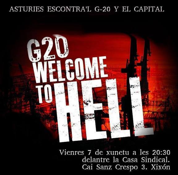 Esta cumbre celebrase nuna ciudá a la qu'aportaron estos dies 21.000 policies pa tratar de contener les protestes organizaes escontra lo que nun ye más que la representación fisica del sistema capitalista que,cada dia más,tratanos como obxetos que puen usase o tirar al vertederu del paru y la miseria segun les sos necesidaes