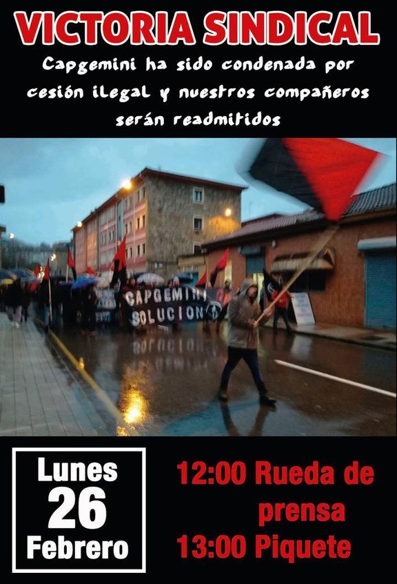 En los diez años que Capgemini lleva en La Felguera los sindicatos del sistema, que están implantados en la empresa, han sido incapaces de conseguir una sola migaja: "Todo es imposible…", "esto no se puede…", "así no…", "son de contratas…". La CNT, sindicato de combate, mediante la unión, la acción directa y la lucha obrera ha dado el primer paso y ha abierto la puerta a que doscientos trabajadores pasen a ser fijos en la empresa.