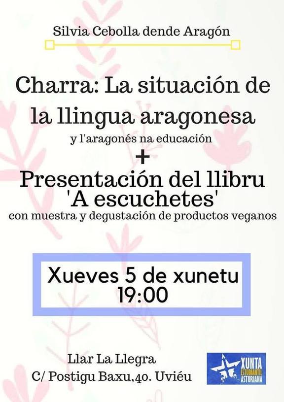 Dende la Xunta Estudiantil Asturiana entamamos esti xueves 5 de xunetu una charra na que falaremos de la situación del aragonés y de la llingua aragonesa na educación con Silvia Cebolla, que acaba espublizar un llibru con delles recetes veganes escritu n'aragonés. Tamién va presentanos esi llibru y va facenos una demostración de dalgunes recetes veganes y vamos poder degustales y cenar.