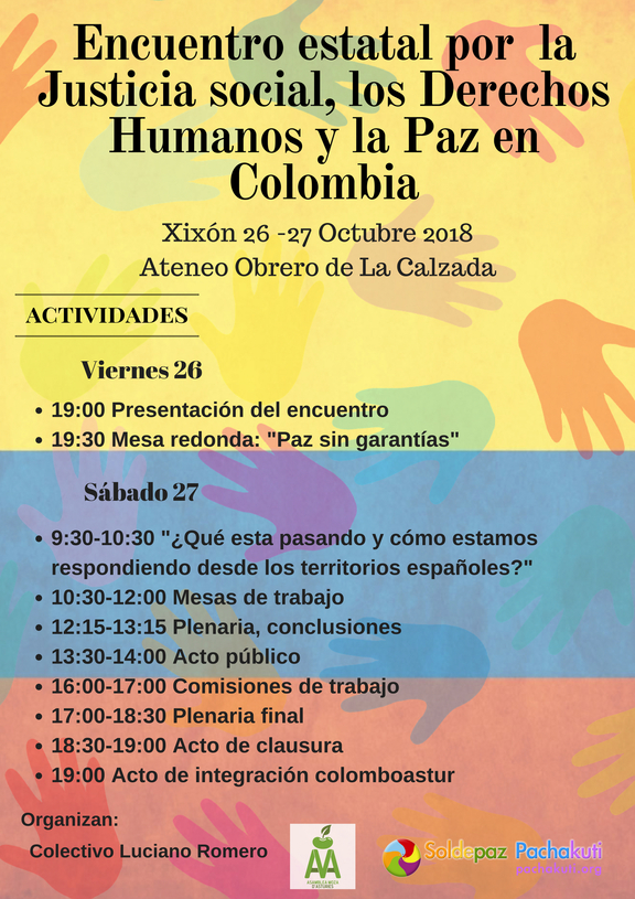 Con ese ánimo se convoca al Encuentro por los Derechos Humanos, la Justicia social y la Paz en Colombia a realizarse los días viernes 26 y sábado 27 de octubre en Gijón, dando continuidad a los encuentros de Extremadura y de Madrid realizados este año con igual fin.