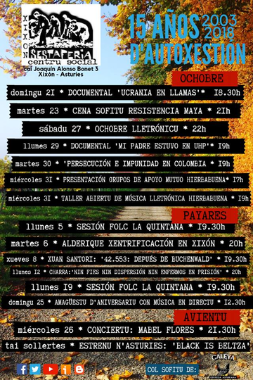 En Sestaferia tamos d'aniversariu y tendremos actividaes abondo pa los últimos meses del añu. No que queda d'ochobre pasaremos dos documentales. 'Ucrania en llamas' (día 21) ye'l documental producido por Oliver Stone que censuraren en Ucrania y EEXX. 'Mi padre estuvo en UHP' (29) fala cola fía de José María Martínez. Esta vegada pasaremos la versión íntegra del trabayu. Tamién tendremos una cena solidaria pa sofitar a los pueblos mayes en llucha en Guatemala (23), una charra alrodiu la persecución a activistes y sindicalistes en Colombia (30) y una nueche de lletrónica con DJs d'equí y de llonxe (27). Hierbabuena Salud Mental van averanos al furrulamientu de los grupos d'apoyu mutuo (31) nun actu cola collaboración de Orgullo Loco Astur que tendrá como colofón una amuesa de lo que se ta faciendo nel tallerín de música lletrónica.