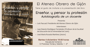 El próximo martes, 4 de diciembre, a las 19H.00', en el vestíbulo de la 2ª Planta de la Escuela de Comercio (Cl Francisco Tomás y Valiente, 1), tendrá lugar la presentación del libro Enseñar, y pensar la profesión. Autobiografía de un docente, de José María Rozada Martínez.