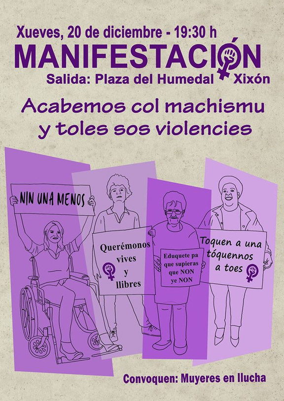 Dende Muyeres en llucha ponemonos en contautu con vos pa invitavos a participar na manifestación que tendrá llugar en Xixón el xueves 20 de diciembre. Como tolos años cerramos esti añu de llucha escontra el machismu y toles sos violencies recorriendo les cais y glayando toes y toos en comuña por una sociedá xusta ya igualitaria.